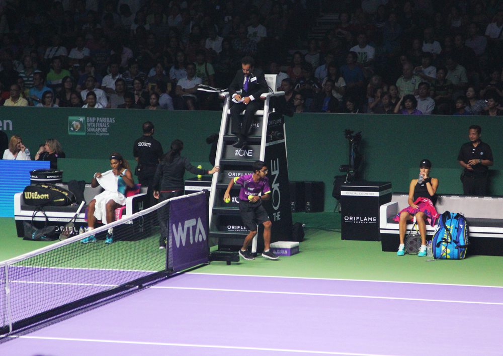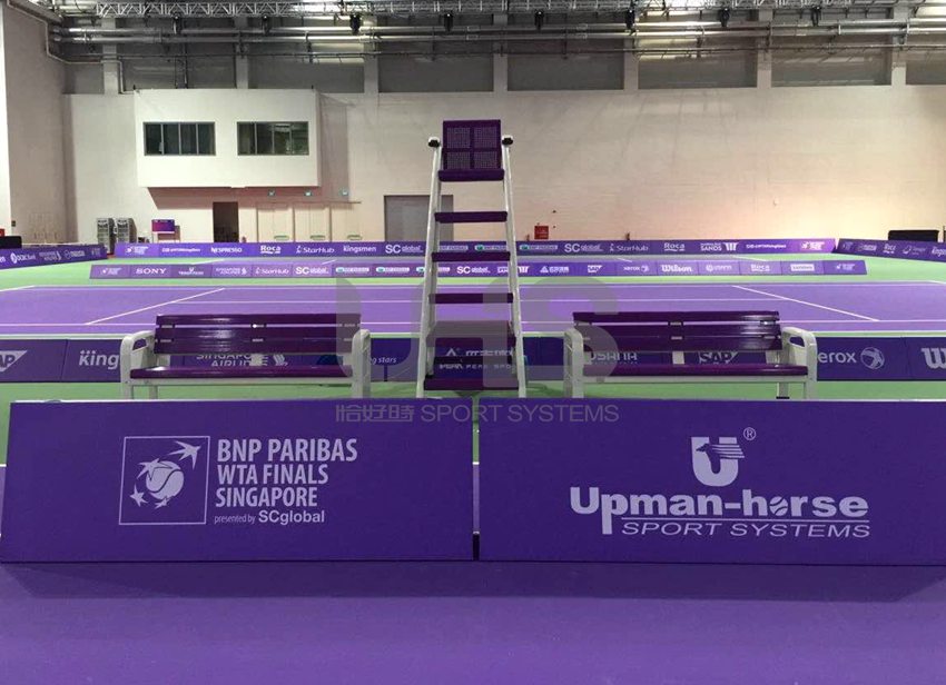 WTA年终总决赛的举办地位于新加坡体育城,中心球场是封闭的室内球馆。与刚刚结束的中网一样,新加坡总决赛所使用的器材也都是恰好时制造。只不过与中网的天空蓝不一样,新加坡的裁判椅和休息椅选用的是尊贵的紫色,这与球场地面的颜色相得益彰,显得更为协调、美观、大方。