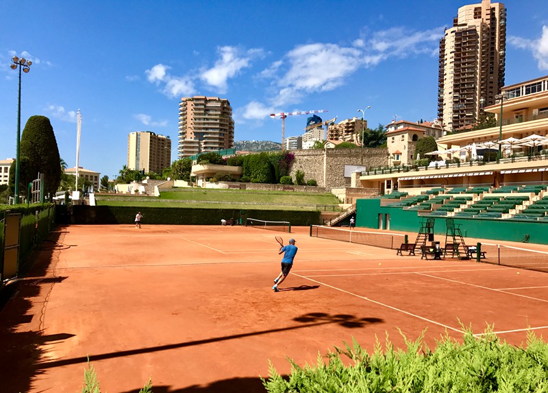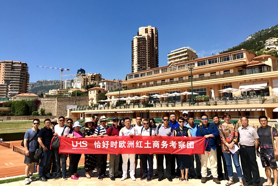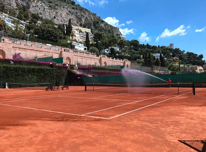 由于4月份的蒙卡赛事结束不久,俱乐部目前正在对球场进行翻新维护。工作人员对几片场进行补土,洒水。俱乐部工作人员介绍:蒙特卡洛有了网球赛事以来就一直使用红土作为比赛场地,从来没有更换过。实际上红土在地中海沿岸的国家和地区非常普及,我们一路走来在马洛卡、巴塞罗那、尼斯和摩纳哥都看到许多的红土网球俱乐部,除了因为地中海温和湿润的气候更适合红土场地建设之外,当地人对红土的认可和热爱也是重要的原因,红土也由于其独有的传统、古典等魅力一直兴盛不衰,传承数代。多年来,恰好时也致力于将欧洲最传统红土网球场系统原汁原味地引入中国,让志在发展网球运动的国人也能感受到最纯粹最古老的网球文化。