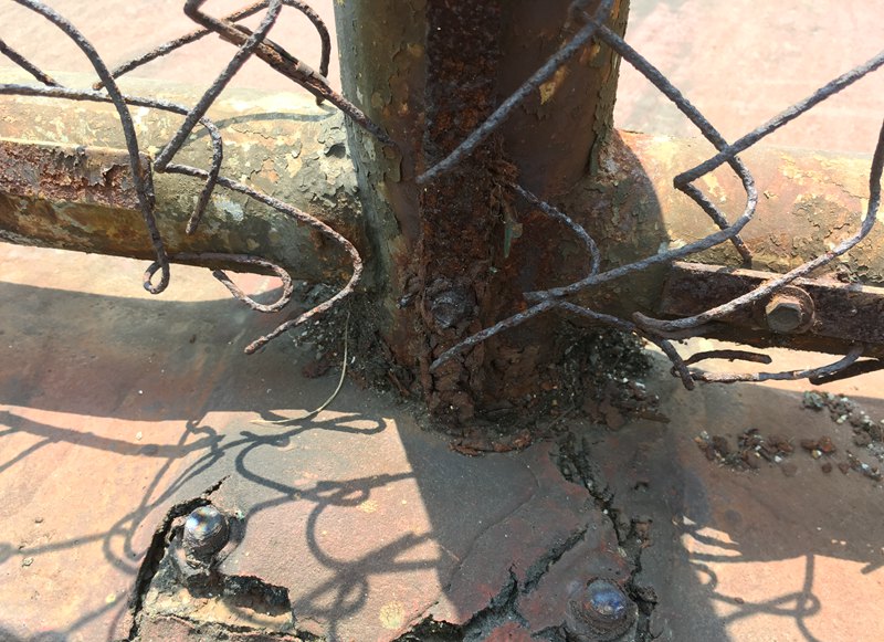 联想到上半年在北京某足球场的围网在5级大风下都“投降”倒下,这样超强风力吹袭倒下则显得合情合理了。综合分析该围网为何会大面积吹倒,应该说焊接式的围网立柱才是真正的罪魁祸首。相比扣件组合式的拼装围网,焊接成本低往往成为低价中标总包的首选。但焊接口容易生锈破裂,并且表面不能喷涂,长期放置在户外容易腐蚀生锈,底部因生锈脱落造成支架很单薄。