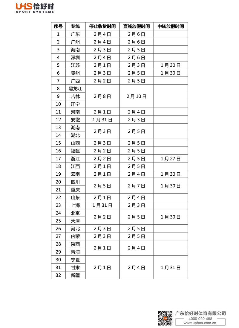 春节将至,全国物流已发出停运通知:自2018年2月1日起截至2018年2月26日止,全国将停止零担货物托运。为避免因物流停运而造成发货延误,请您提早安排订发货事宜,如需帮助,请及时与我司各区域经理联系。