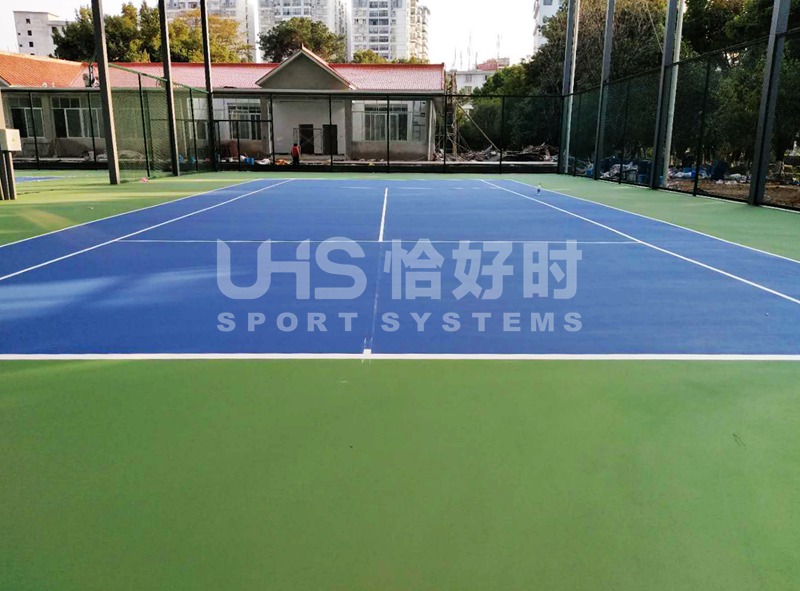 广西贺州市公安局交警支队的室外网球场,是恰好时精心打造的从底层到面料的全系马贝TNS系统。项目于今年年初进行的翻新改造,采用的工法为马贝TNS舒适型(即传统的高弹型工法),使用的面层颜色为内蓝外绿。值得一提,这也是马贝TNS系统在广西区域的首片球场。