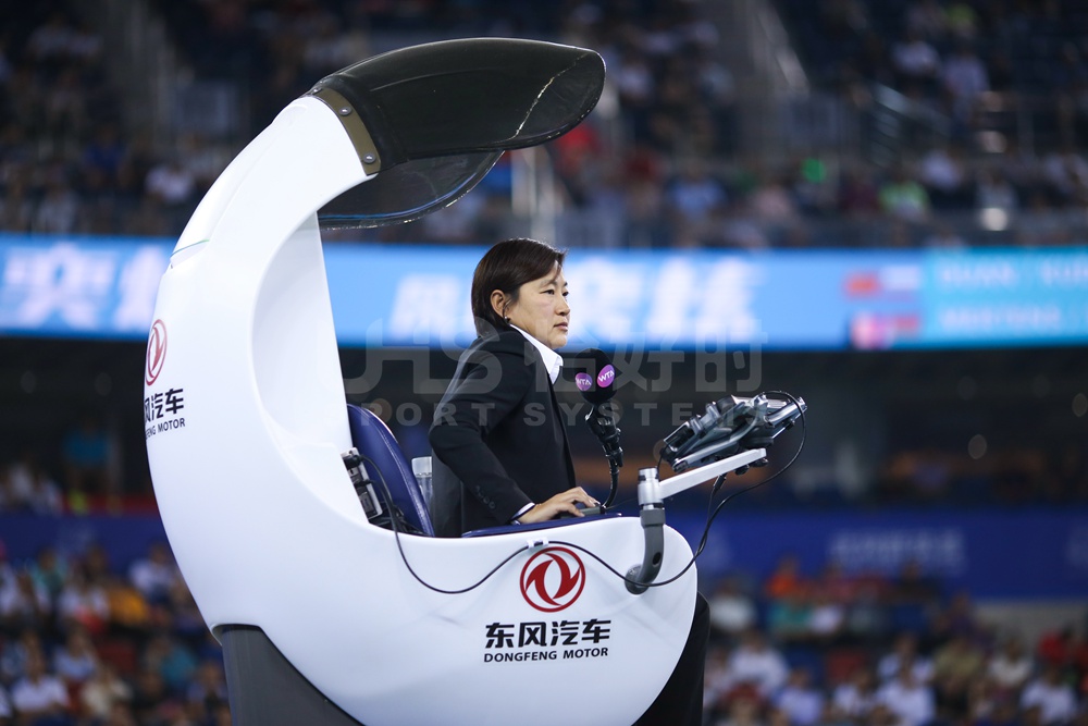 中国著名裁判张娟坐在恰好时智能升降裁判椅上执法比赛(图片来源:视觉中国)