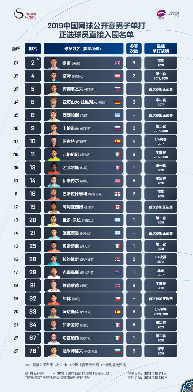 同样备受关注的中网男子阵容同样亮点满满,这份参赛名单吸引到了6位Top10、11位Top20参赛,成名已久的顶级球星和冉冉升起的超级新星之家的对决将成为今年中网男单赛场的最大看点。穆雷、蒂姆、迪米特洛夫、弗格尼尼、伊斯内尔、阿古特、孟菲尔斯以及卫冕冠军巴斯拉什维利等实力名将,今年在北京将遭到兹维列夫、梅德韦杰夫、西西帕斯、卡恰诺夫、克耶高斯、贝雷蒂尼、阿利亚西姆等95后甚至00后的强有力挑战,是成名已久的老将宝刀不老续写辉煌,还是超级新星一往无前创造新纪录,这绝对是2019年中网的最大悬念之一。