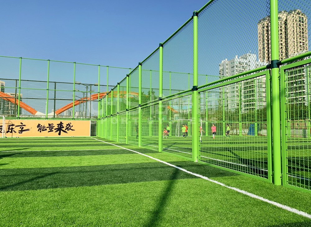 南城文化广场位于东莞市四环路宏远大桥下的东莞运河和东江河之间,占地面积16万平方米。今年11月底刚完成改造工程。这里新建了5片全新的人造草足球场,其中7人场2片、5人场3片。球场围档全部采用恰好时UHS-0203波浪网拼装笼式足球场构建而成。其中8米高的围档是恰好时首次应用到项目中,在竣工后,这里还举办了2019东莞市足球联赛。