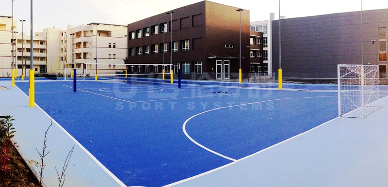 多功能球场一般建于面积受限的场地,常见的有足篮多功能球场、篮羽多功能球场、羽排多功能球场。一般多建于中小学,可满足学生多类型的球场使用。好处是一场多用,缺点就是运动的体验较差。