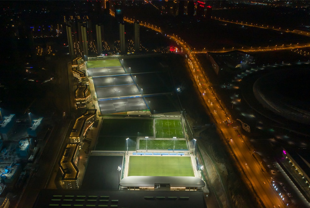作为大连万达集团投资20亿打造的国际超一流足球基地。大连足球青训基地已于2019年12月底顺利竣工。该项目位于大连市甘子井区,毗邻大连体育中心。占地22公顷,总建筑面积9万平方米,共建设23块训练比赛场地,其中12块标准球场,6块灯光球场、2块草坪加热球场、2块室内球场以及1块5000座比赛球场。青训基地设计5栋大楼,配备世界一流的住宿、教学、康复、会议等配套设施。可以满足职业足球俱乐部一线队、预备队、青少年队、女足等18支球队、共600名教练员和运动员的需求。是目前国内规模最大设施最完善的足球青训基地。同时也是2021年世俱杯(已延期)、2023年亚洲杯的重点工程。可谓集光环与荣华于一身的超级工程。