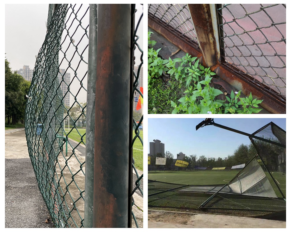 传统足球场围网多采用钢构框架和PE包塑围网组成。在球场多次使用后及足球的冲击下,容易出现以下各种问题,因此不适于采用。
