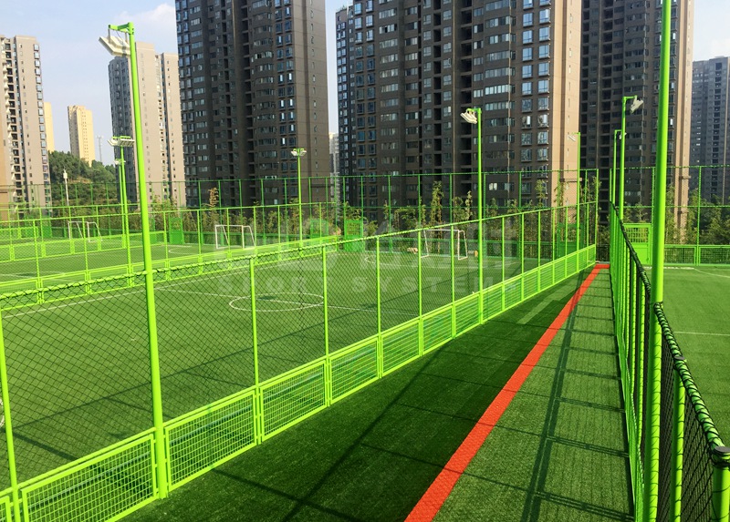 足球场是面积最大的球场之一,选择坚固、抗风、耐撞击、抗腐防锈的围网是很有必要的。而且高度方面也有要求,一般11人的足球场会选择8米高围网、7人至少是6米,5人或3人的小型足球场也至少需要4米高。材质方面一般使用经过镀锌的钢结构型材,经过镀锌后可保证钢长时间在复杂天气下不会生锈腐蚀,钢相对铝有更强的硬度、更高的承载力,这能保证大部分露天的足球场具有完美的抗风效果。结构方面考虑到足球场基本都在户外,经历多种复杂天气。选择普通的编织围网容易造成使用后出现围网起鼓、变形、开裂的现象。因此,足球场围围网尤其是下围挡部分建议使用出厂便预制好的钢结构框架。例如波浪网框架或双夹丝网。
