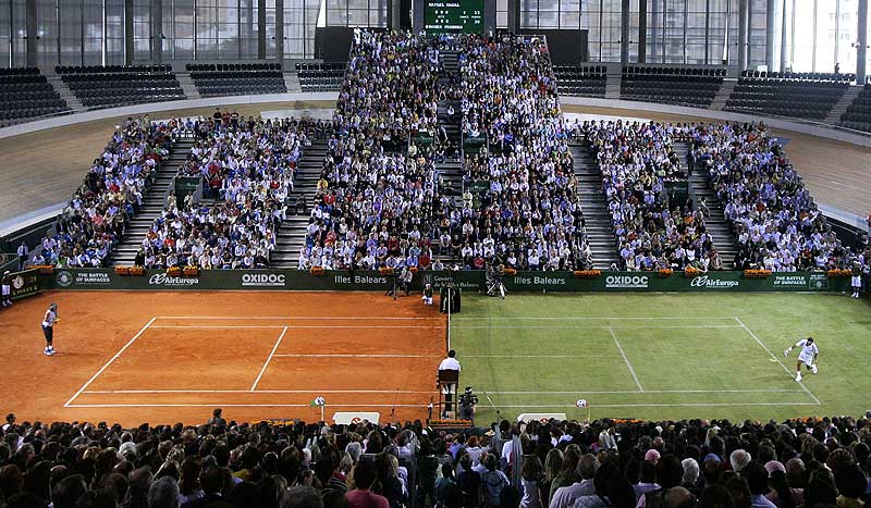 这座球场只举办过一场比赛,却是地表最强的草地王者VS红土之王的PK赛。这就是2007年位于西班牙马洛卡的费德勒-纳达尔表演赛,主办方非常机智地将比赛场地改装成一半红土,一半草地,让最擅长红土的纳豆和最擅长草地的奶牛以最公平的形式决斗。