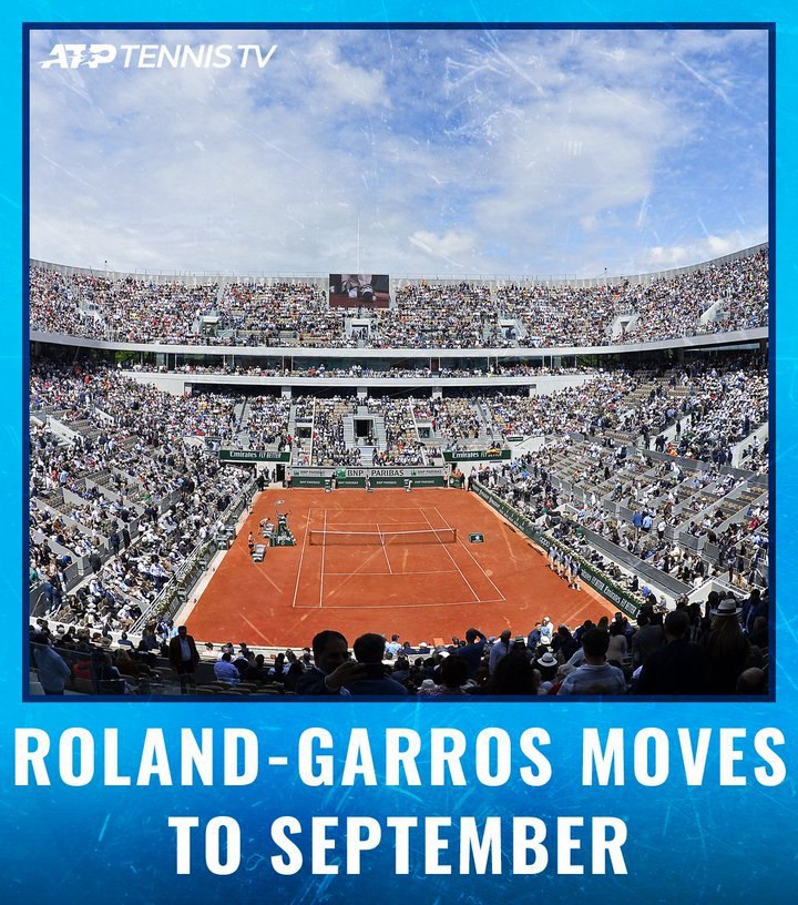 昨晚世界体坛有两条爆炸性新闻:一条是原本于今年6月份举办的欧洲杯宣布延期至明年6月。当然这个消息之前就有媒体透露,算是官宣了而已。另一条则是完全出乎所有人意料的单方面宣布:原定于今年5月24日-6月7日举办的本年度第二项大满贯赛事法国网球公开赛延期至今年9月20日-10月4日举办。