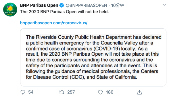 受新冠肺炎疫情影响,本年度ATP印第安维尔斯大师赛、WTA印第安维尔斯皇冠赛今天宣布取消,这也是疫情发生以来取消的最高级别网球赛事。