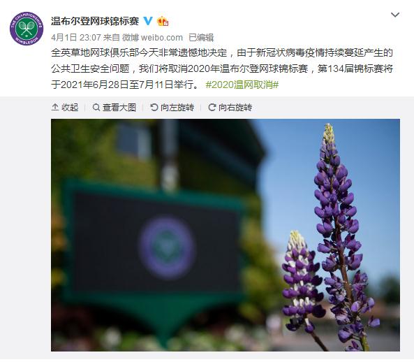 温网官方在声明中说:全英草地网球俱乐部今天非常遗憾地决定,由于新冠状病毒疫情持续蔓延产生的公共卫生安全问题,我们将取消2020年温布尔登网球锦标赛,第134届锦标赛将于2021年6月28日至7月11日举行。