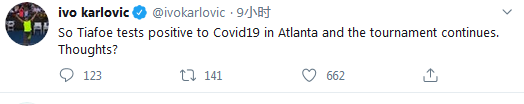卡洛维奇在推特上写道:蒂亚福新冠检测阳性后,比赛还继续进行。你们的想法是?