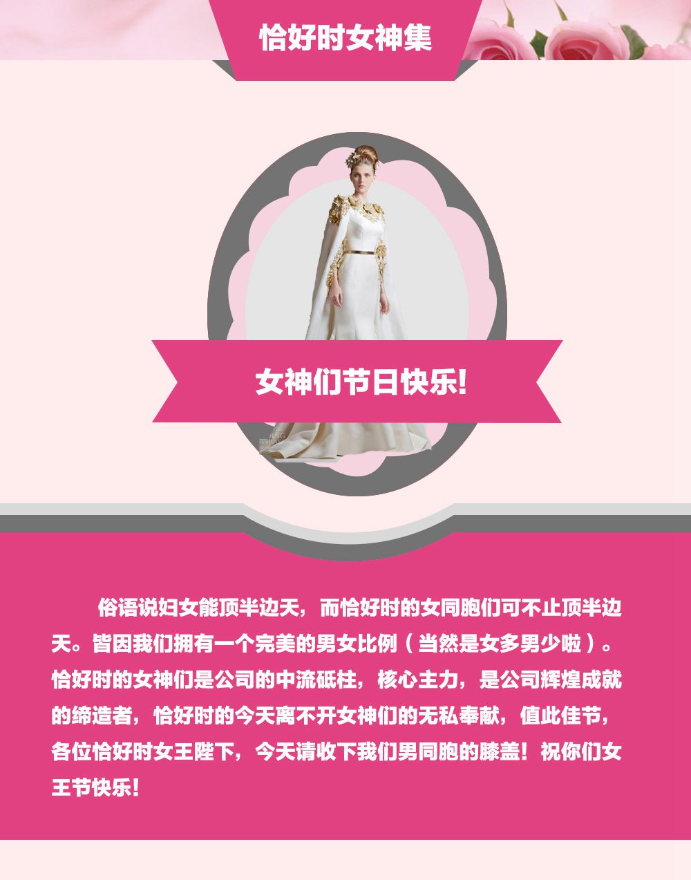 恰好时的女神们,遍布公司每个部门,为公司的发展壮大作出不可磨灭的贡献,今天是国际妇女节,在此,对广大恰好时的女神们,对全天下的女性同胞们,真诚道一声:你们辛苦了,节日快乐!