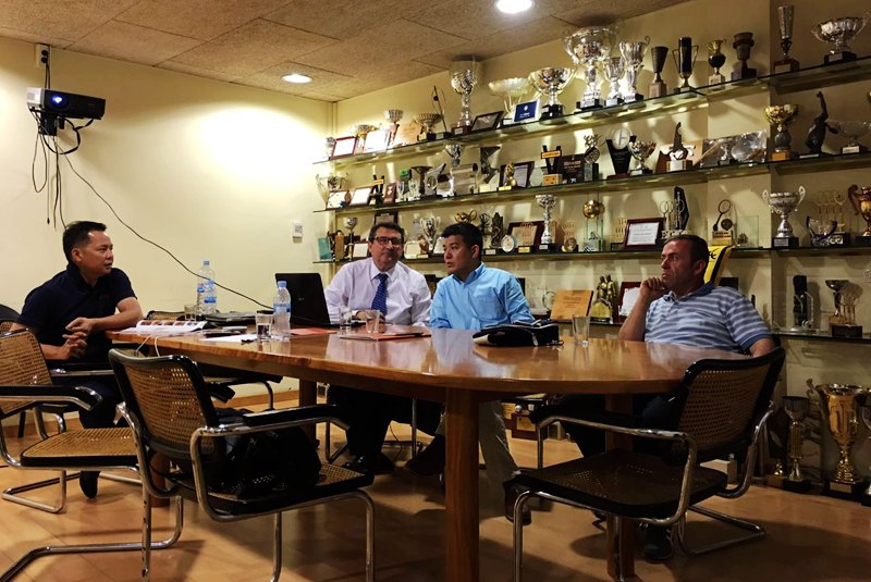 欧旭亚先生(左一)与法网官方代表洽谈