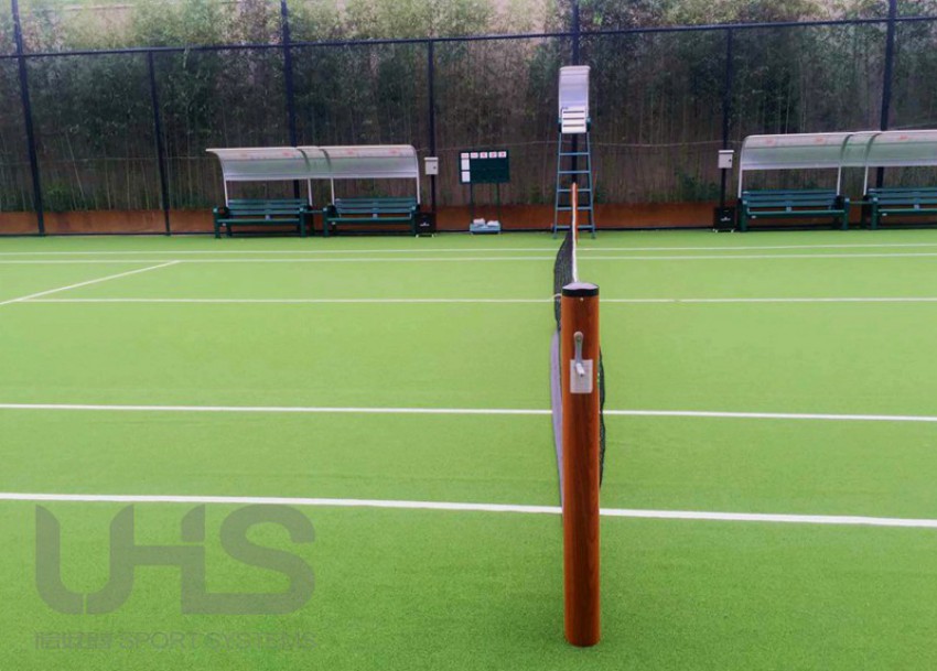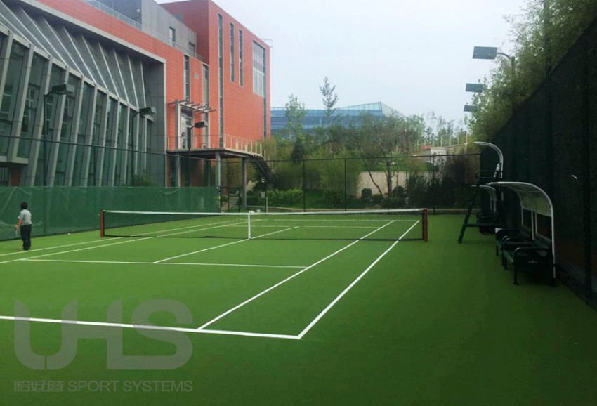 北京某上市公司园区的人造草网球场位于北京市海淀区上地创业路,网球场铺设恰好时自主研发的全新无填充网球场人造草,并根据人造草特色搭配TP-2008的木纹色网球柱,森林绿色的裁判椅TP-809,及带遮阳篷的森林绿休息椅TP-108,整体呈现效果与温布尔登的全英网球俱乐部非常相似。树立在高楼林立的城市中,犹如一抹亮眼的绿洲,显得光彩夺目,极为抢眼!