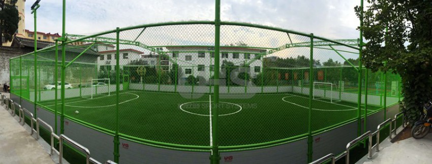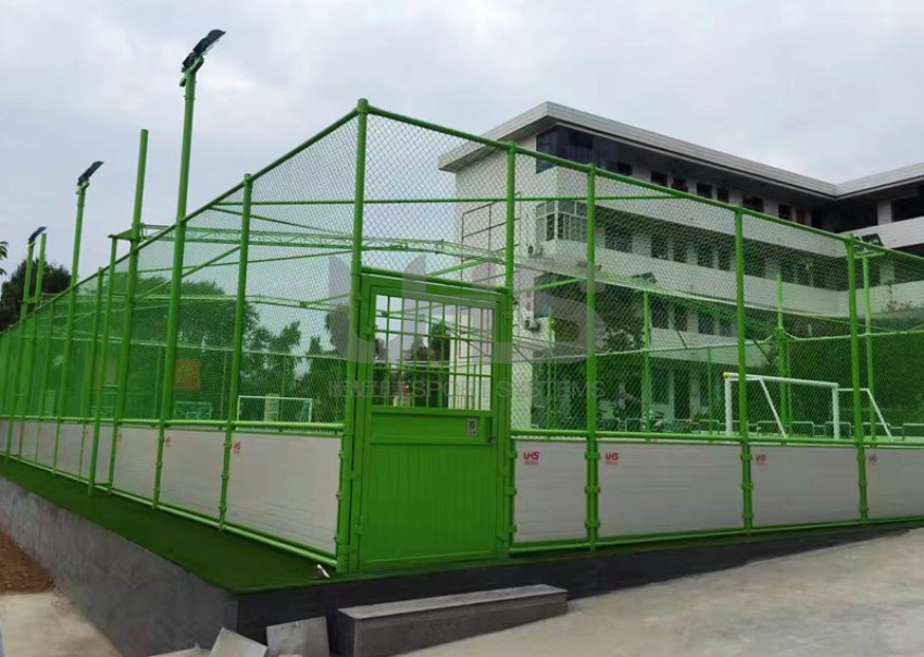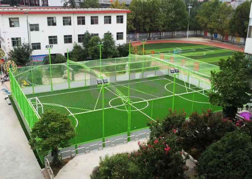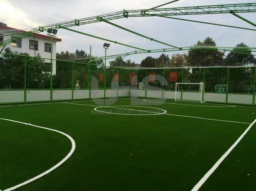 陕西省丹凤县西街小学坐落于冠山脚下,丹水河畔,属市、县标准化小学。学校占地面积14133平方米,建筑面积6068平方米,该学校的新建笼式足球场为标准的5人场,采用恰好时UHS-1008精铸合金十字扣件和锌合金复合挡板拼装而成。为防止皮球出界还在顶部增加隔离软网和桁架。使孩子们能在球场内尽情地享受踢球的乐趣。