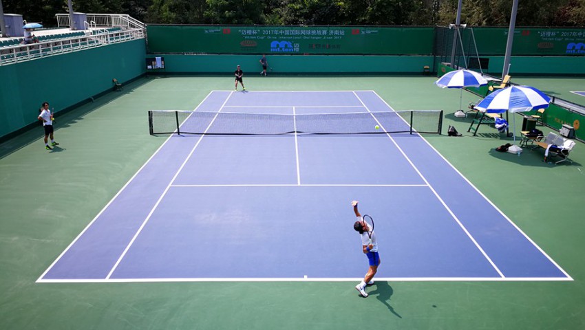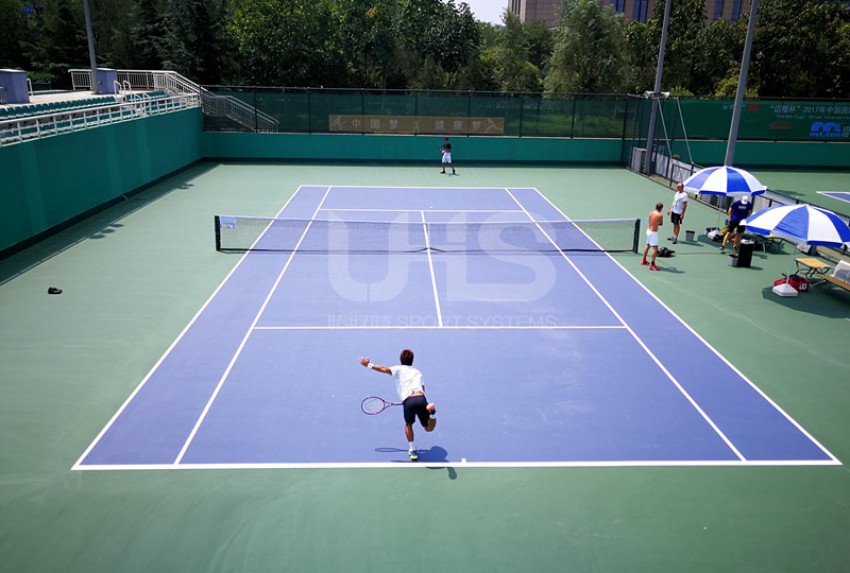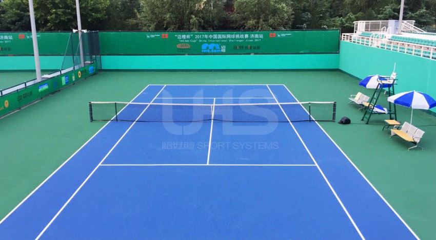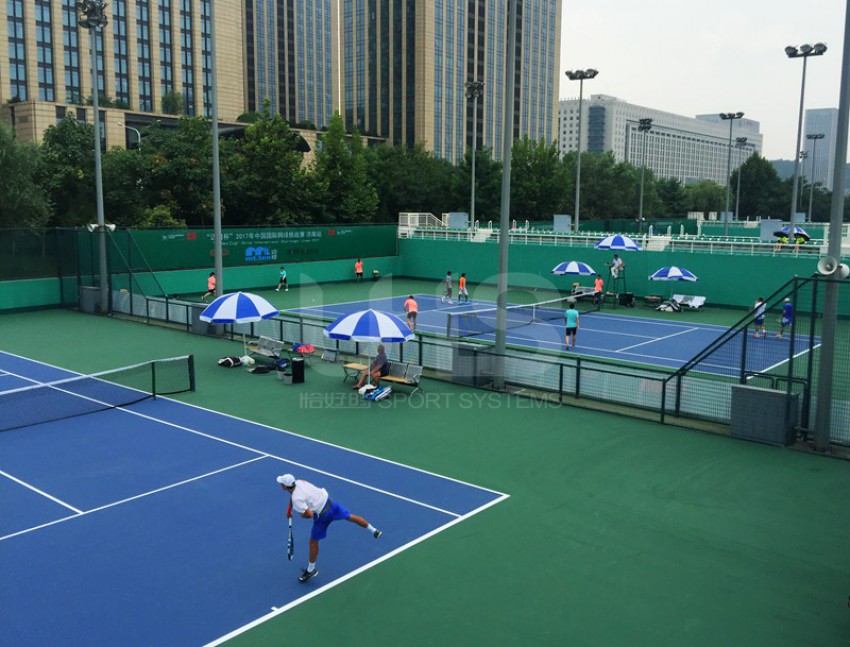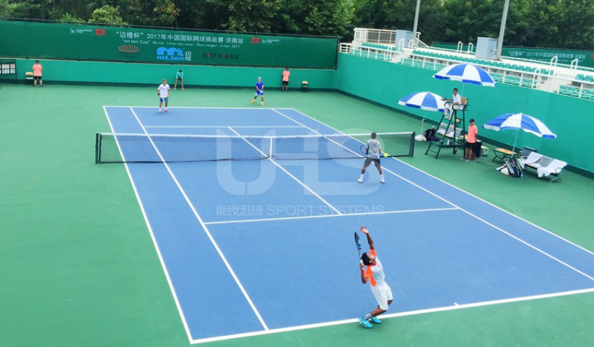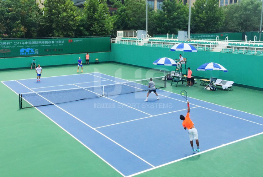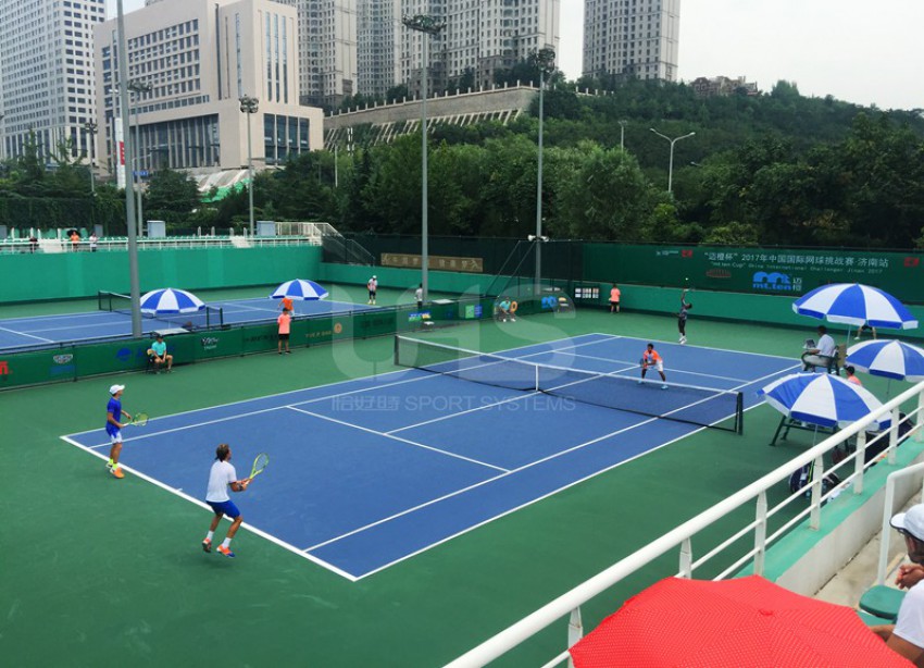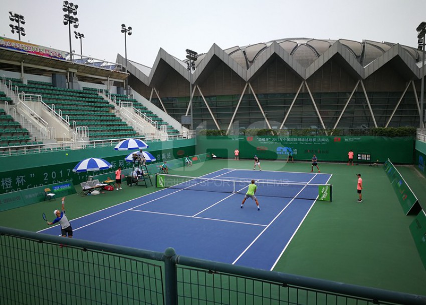 济南奥体中心网球馆位于济南市历下区经十东路,是2009年第十一届全运会的网球比赛的举办场地。今年奥体中心将迎来2017年ATP国际网球挑战赛济南站的比赛,因此,组委会对12片外围球场进行了地面的翻新,场地全部使用恰好时今年代理的托柏斯丙烯酸地材系统。颜色为深蓝+深绿的传统搭配。此外,本届赛事的裁判椅也是恰好时经典的TP-809。