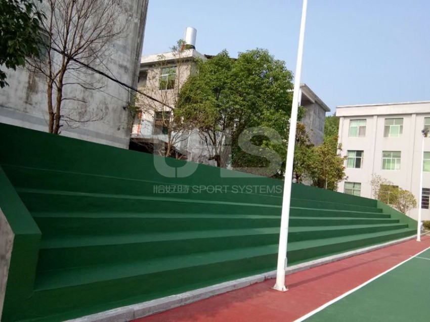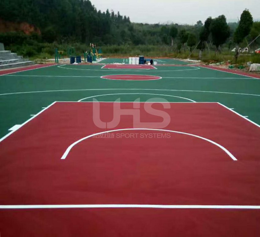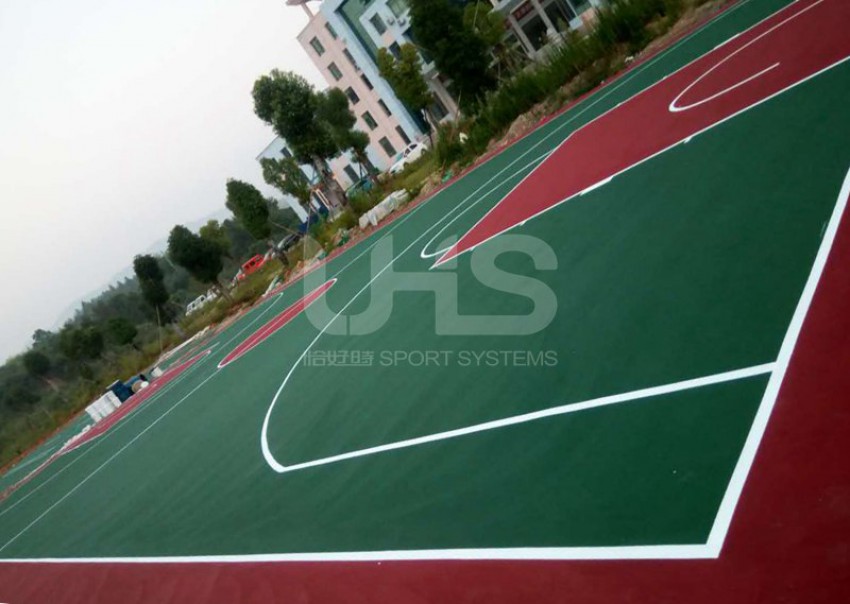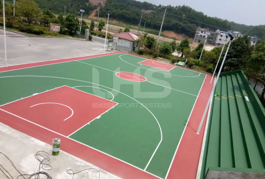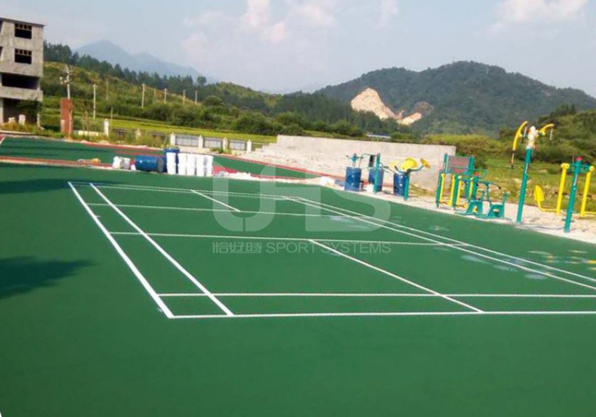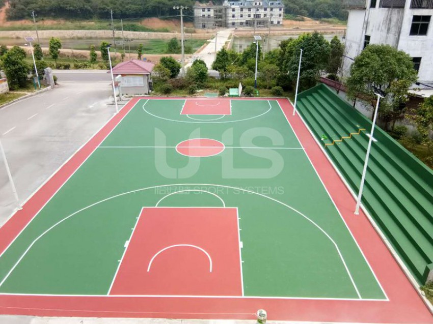 江西省抚州市乐安县两个丙烯酸项目均采用恰好时旗下丙烯酸品牌托柏斯,其中大马头乡篮球场的地面采用绿+红的颜色搭配,外场使用深绿色;招携镇篮球场采用深绿+深红颜色组合,羽毛球场采用全绿色。
