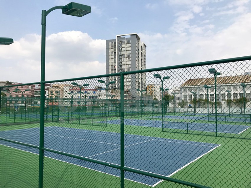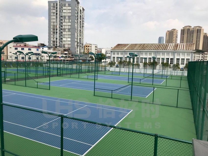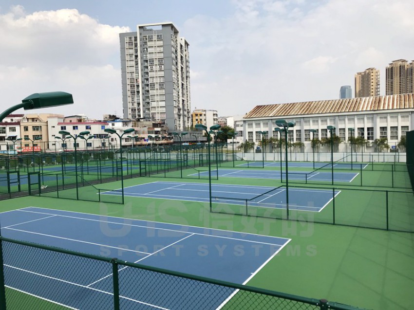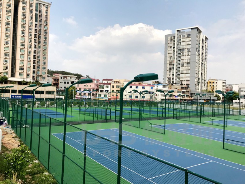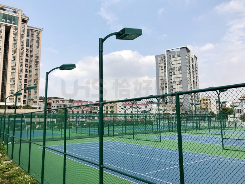 东莞市体育中心位于东莞市南城区体育路3号,地处南城区核心地域。体育中心占地面积为37720平方米。项目是今年翻新的6片网球场,围网全部采用UHS-1007精钢冲压扣件拼装围网,灯光则是UG-1000泛光灯。此外,球场场地器材也都是恰好时制造。