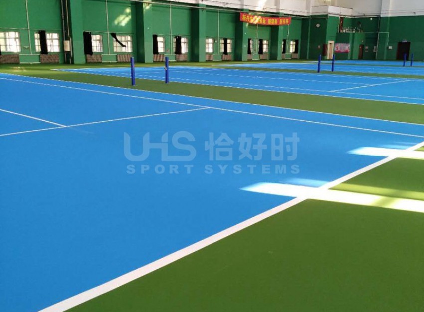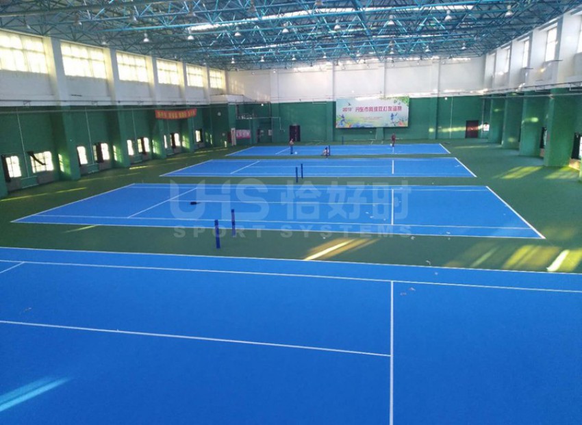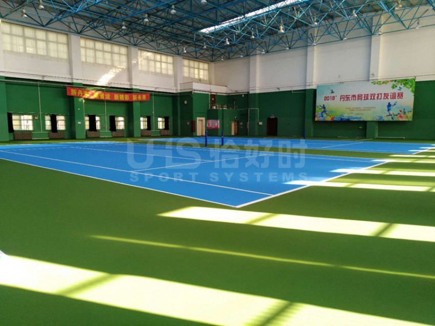 丹东市业余体育学校位于辽宁省丹东市辽宁省丹东市振兴区振七街52号,这里有4片室内网球场在不久前进行了翻新。所使用的地面涂料均为恰好时旗下知名丙烯酸品牌TOPLUS托柏斯,颜色为内场深蓝,外场绿色。