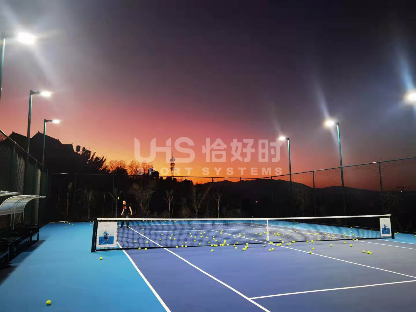 该网球场还配备了恰好时的TP-3000网球柱,TP-068休息椅,装球车TP-002,网球教练车JLC008,推水器TP-033以及防风网TF-950等一系列体育场地配套设施。多功能的配套设施不仅能满足运动员的多样需求,更让网球运动变得更轻松、愉悦。