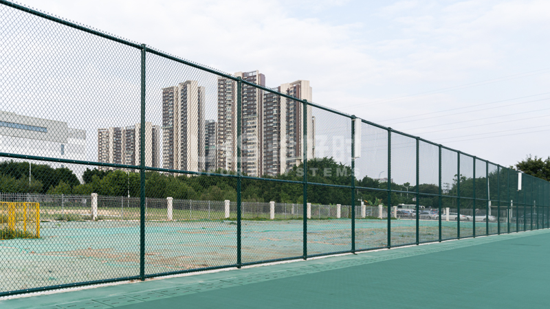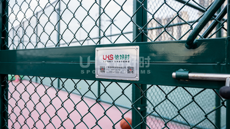 田径场则选用恰好时UHS-1008精铸合金十字扣件拼装围网;