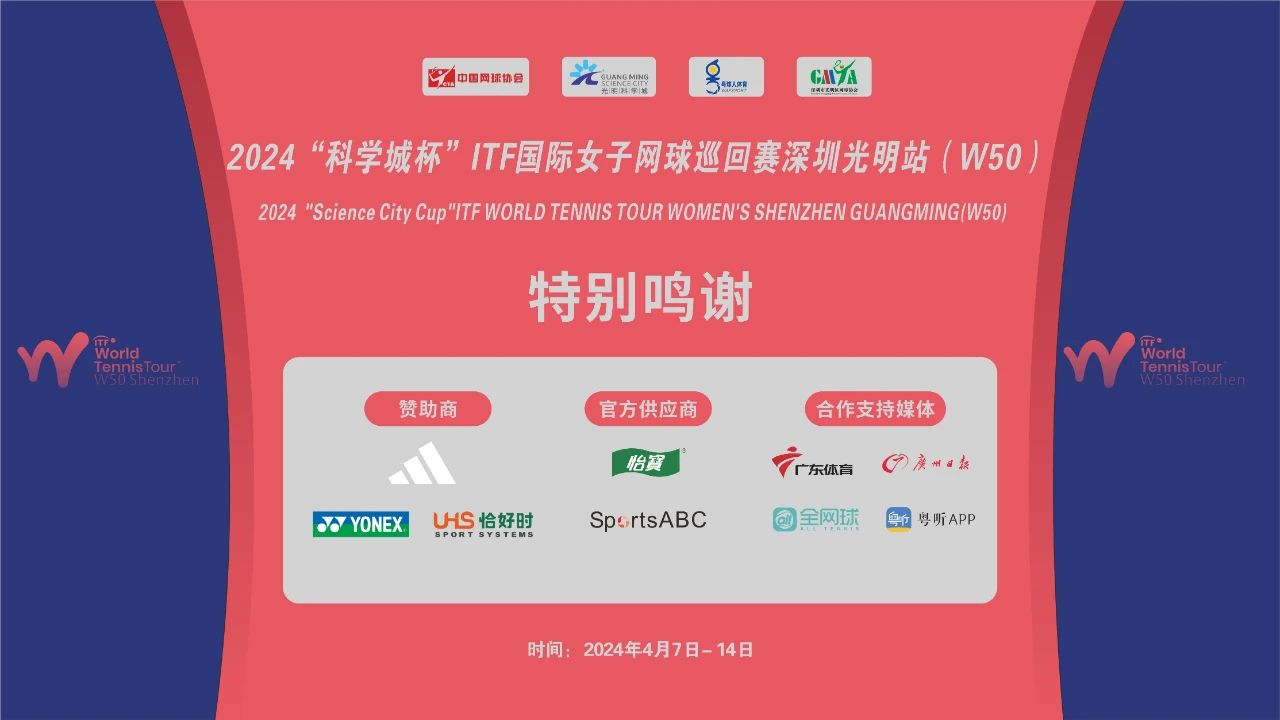 2024“科学城杯”ITF国际女子网球巡回赛深圳光明站(W50)将于2024年4月7-14日在深圳市光明区群众体育中心举行,恰好时将携手本次赛事,助力这场世界级的较量,再度点燃深圳光明区,为观众带来一场视觉与竞技的双重盛宴!