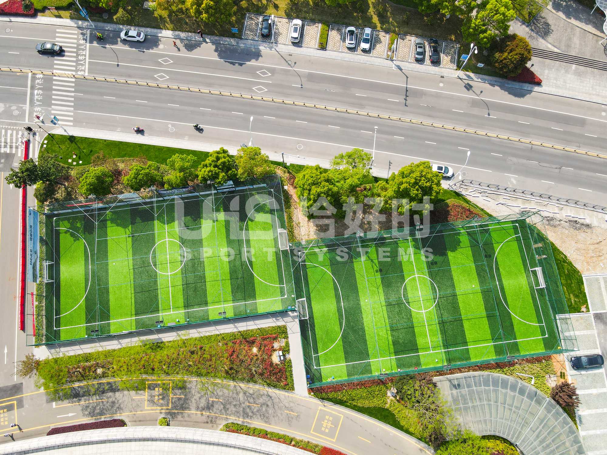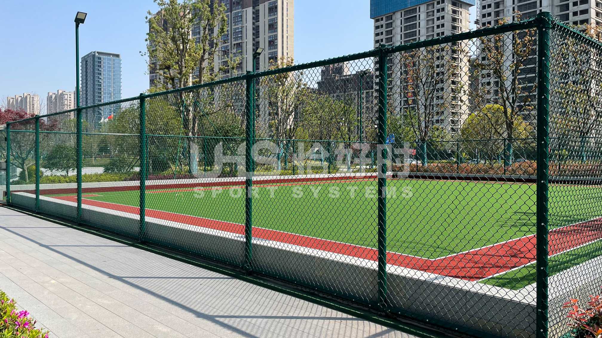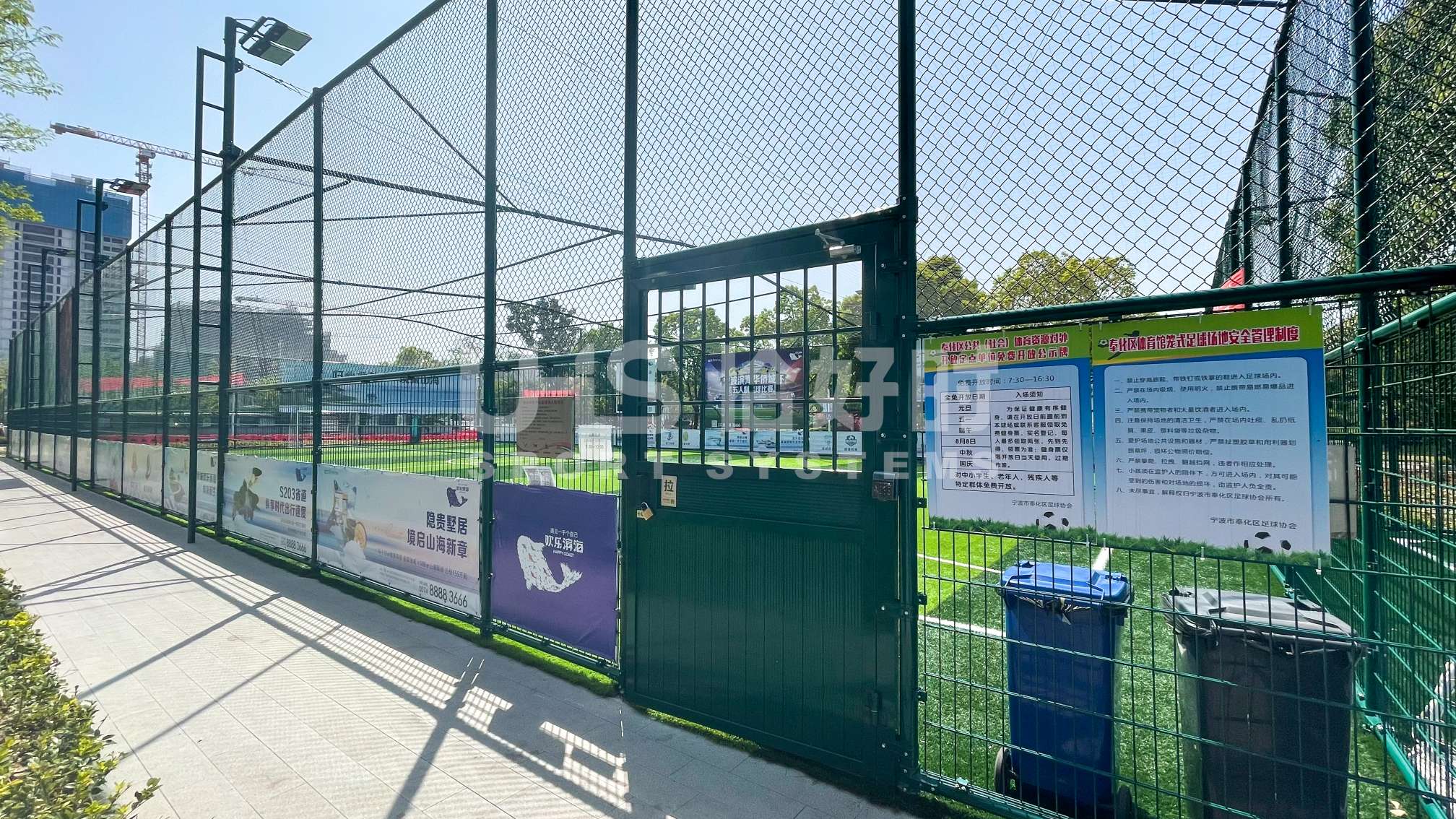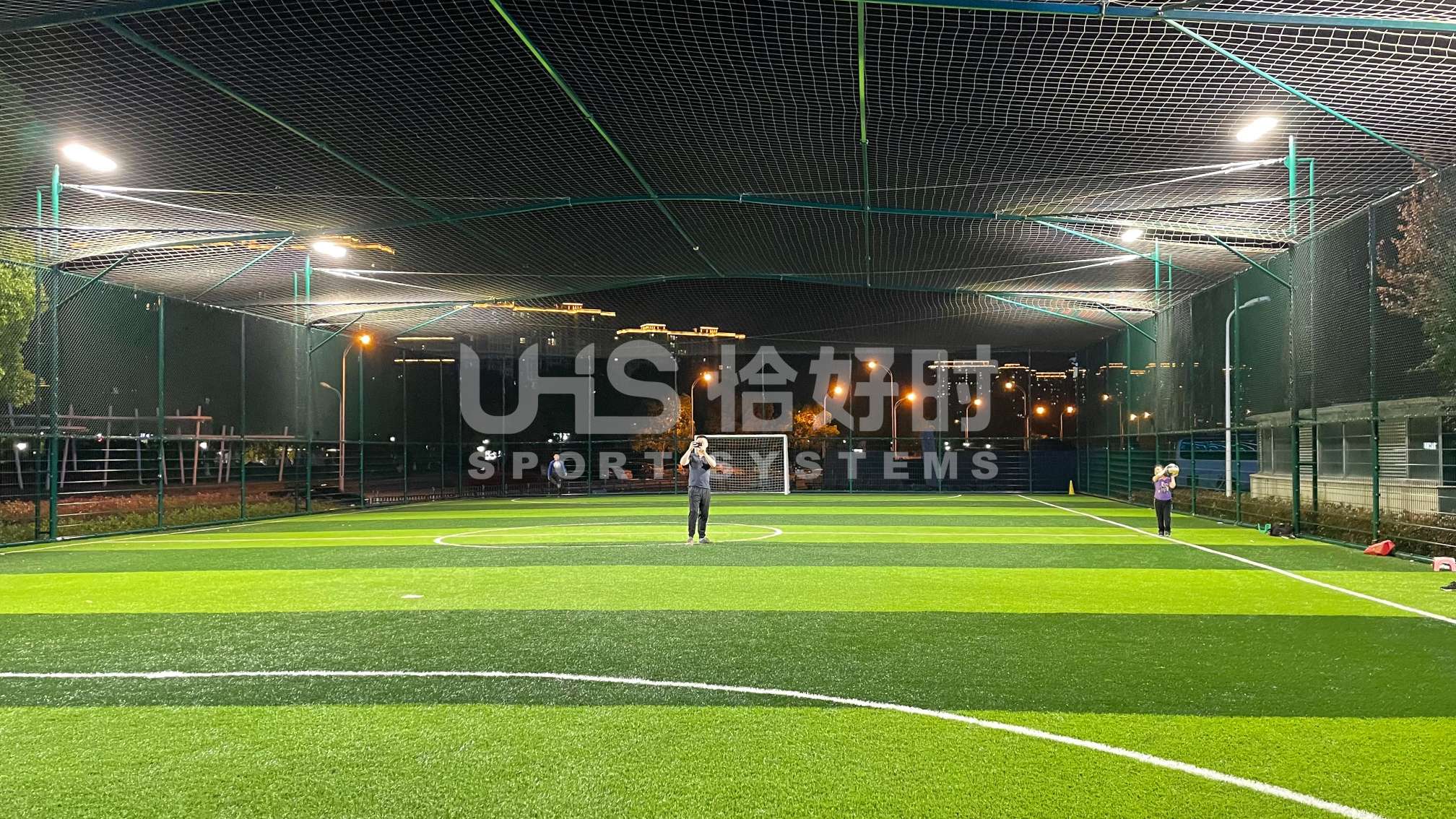 奉化体育中心室外2片笼式足球场,则是应用了恰好时UHS-1010双夹丝拼装围网系统+明利亚照明体育系统LFL系列LED投光灯。UHS-1010双夹丝围网在深圳足球青训基地、大连万达足球青训基地等大型专业足球场地亮相的围网,其极强的抗冲击性和稳定性,可以满足专业竞赛级别足球场的使用需求;搭配UHS-1008精铸合金十字扣件拼装围网,保护群众运动的人身安全,让足球激情无惧释放!